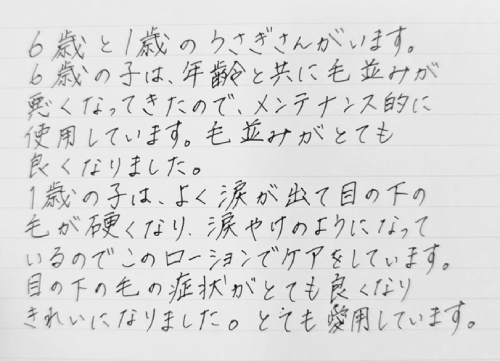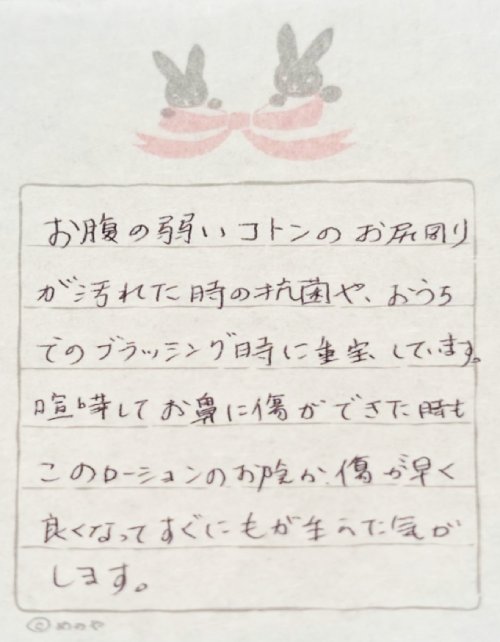 お腹の弱いうさぎのお尻周りが汚れた時の抗菌や、おうちでのブラッシング時に重宝しています。喧嘩してお鼻に傷ができた時もこのローシュンのお陰か、傷が早く良くなってすぐに毛が生えた気がします。